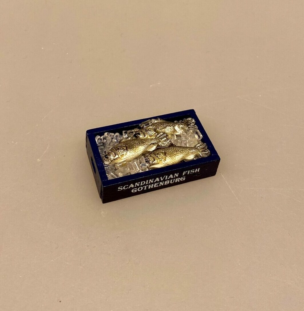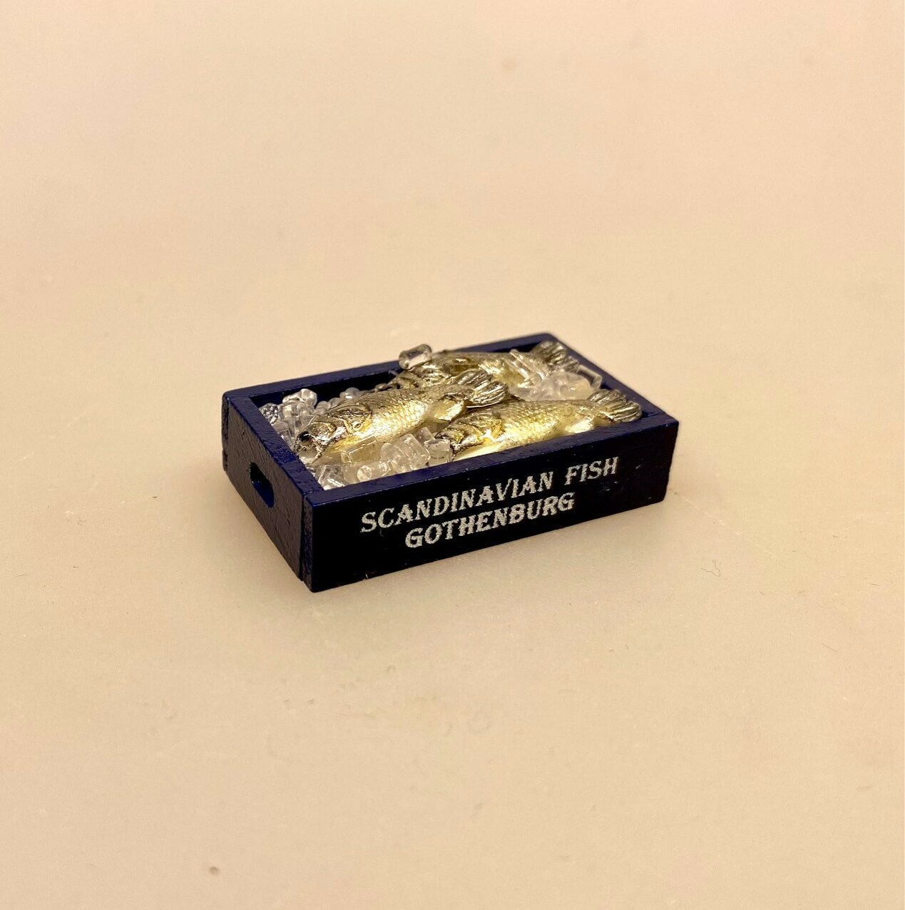 Herlig blå trækasse med hele fisk på is. Trækassen er blåmalet, har bære håndtag og på siderne af kassen står der “Scandinavian Fish Gotheburg”. I kassen ligger 3 lækre hele fisk, omhyggeligt udført med småbitte skæl og malet i de helt rigtige nuancer af sølvgrå og gul. Fiskene ligger i et væld af små isterninger – også isen ser fuldstændig livagtig ud.